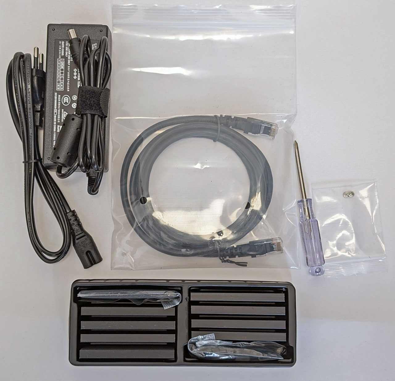 The F8 SSD Plus ships in comparatively nice retail packaging and the NAS is packaged in protective foam, which might actually be a bit excessive, considering how light the device is. The bundled accessories are a tad different from what you normally get with a NAS, although you do get a power adapter, an Ethernet cable and a couple of screws, as well as a small screwdriver. However, what stands out is the small tray filled with eight heatsinks, the accompanying 16 rubber bands that are used to attach the heatsinks to your SSDs, and eight rather thick thermal pads. We'll take a closer look at how well setup this works or doesn't work later in the review.
